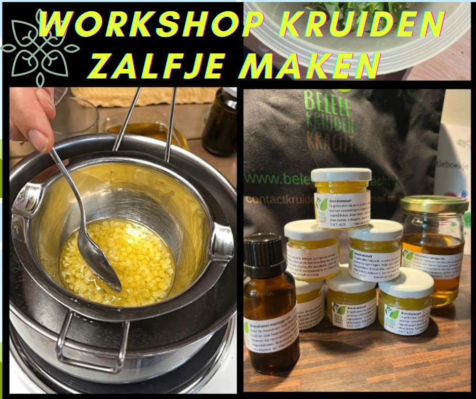 De kruiden die daarvoor gebruikt worden zijn door mij al eerder geoost en daarvan heb ik een maceraat gemaakt (een kruidenolie die 6 weken heeft getrokken) die stappen neem ik met je door. Daarna ga je samen met anderen een kruidenzalfje maken waarvan je ook één potje kruidenzalf mee naar huis krijgt met ook de beschrijving.
